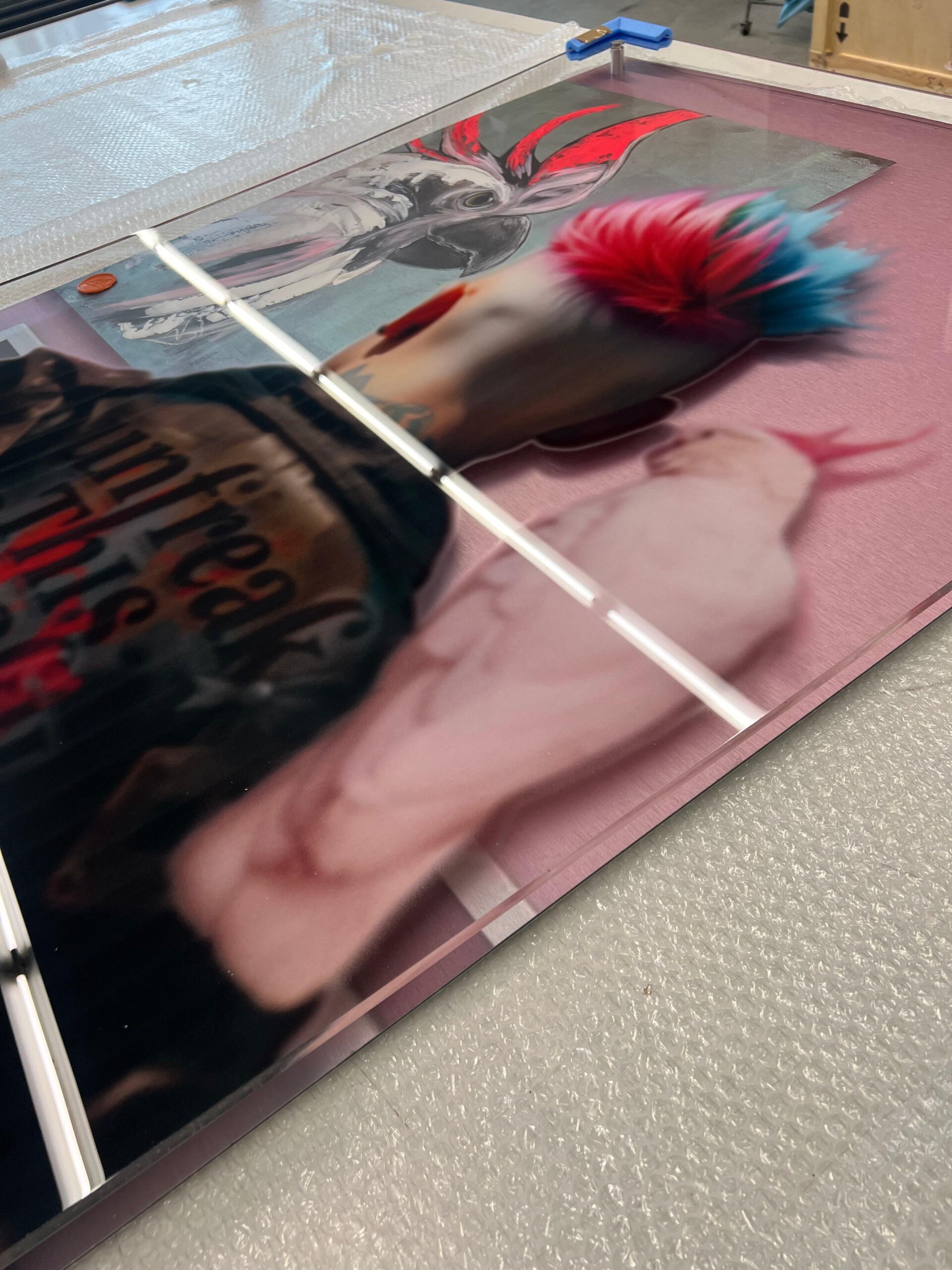 Schwebend in 2,5 cm Abstand montiert eine Acrylglasscheibe mit Print (Punk & Kakadu)